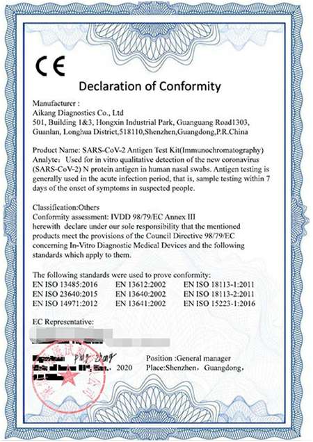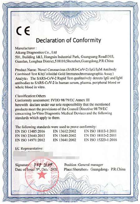 深圳爱康自主研发的新型冠状病毒 (SARS-CoV-2) IgG/IgM抗体联合检测试剂盒和新型冠状病毒 (SARS-CoV-2) 抗原检测试剂盒,按照欧盟体外诊断医疗器械指令98/97/EC相关规定及CE合格认证程序要求,完成了欧盟CE准入认证,并于近期进入了中国医药保健品进出口商会官网公布的取得国外标准认证或注册的医疗物资生产企业清单(简称医保商会白名单),进一步参与到国际抗疫之中!