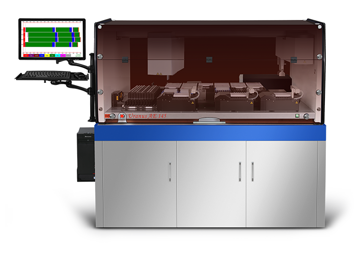 URANUS AE全自动酶免仪是由爱康公司自主研发生产,全自动完成ELISA实验,包括标本分配、试剂加注、振荡、孵育、洗板、酶标判读,适用于各类血液机构。